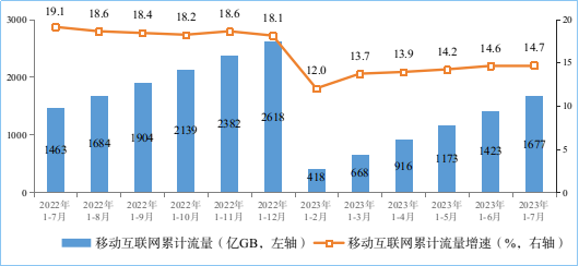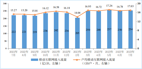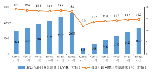 移动互联网用户户均流量(DOU)维持高位。1—7月份,移动互联网累计流量达1677亿GB,同比增长14.7%,增速较上半年提升0.1个百分点。截至7月末,移动互联网用户数达14.94亿户,比上年末净增4032万户。7月当月户均移动互联网接入流量(DOU)达到17.03GB/户·月,同比增长11.6%,较上年12月份高0.85GB/户·月。
