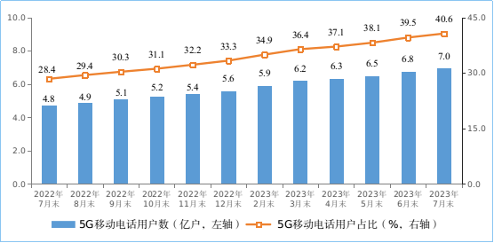 5G移动电话用户占比超四成。截至7月末,三家基础电信企业的移动电话用户总数达17.11亿户,比上年末净增2782万户。其中,5G移动电话用户达6.95亿户,比上年末净增1.34亿户,占移动电话用户的40.6%,占比较上年末提高7.3个百分点。