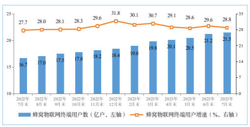 蜂窝物联网用户规模持续扩大。截至7月末,三家基础电信企业发展蜂窝物联网终端用户21.48亿户,比上年末净增3.04亿户,占移动网终端连接数(包括移动电话用户和蜂窝物联网终端用户)的比重达55.7%。IPTV(网络电视)总用户数达3.93亿户,比上年末净增1292万户。