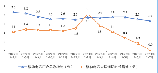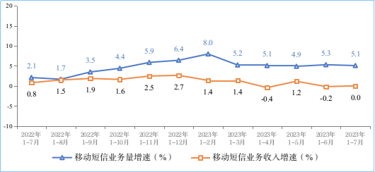 移动传统业务持续收缩。1—7月份,移动电话去话通话时长完成1.31万亿分钟,同比下降0.9%;固定电话主叫通话时长完成460.5亿分钟,同比下降4.8%。1—7月份,全国移动短信业务量同比增长5.1%,移动短信业务收入与去年同期持平,增速较上半年分别回落0.2个和提升0.2个百分点。