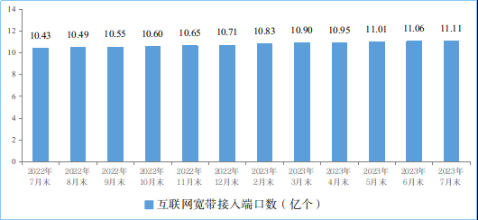 千兆光纤宽带网络方面。截至7月末,全国互联网宽带接入端口数量达11.1亿个,比上年末净增3997万个。其中,光纤接入(FTTH/O)端口达到10.7亿个,比上年末净增4388万个,占互联网宽带接入端口的96.2%,占比较上年末提高0.5个百分点。截至7月末,具备千兆网络服务能力的10G PON端口数达2096万个,比上年末净增573.5万个。