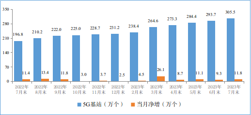 5G网络建设方面。截至7月末,5G基站总数达305.5万个,占移动基站总数的26.9%。
