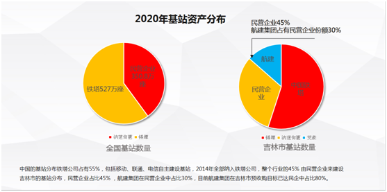 吉林市的基站分布,民营企业占比45% ,航建集团在民营企业中占比30%,目前航建集团在吉林市预收购目标已达民企中占比80%。