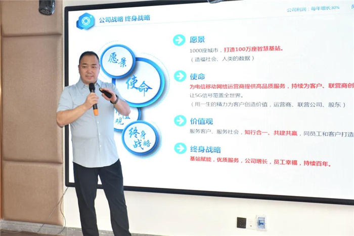 航建集团董事长于伟先生指出,此次员工大会不仅仅是一次发展大会,更是一次变革大会。于董对各个部门工作岗位、职责进行了梳理,并以别开生面的吐槽形式具体指出了当下各部门存在的核心问题,同时也对各部门领导提出了更高要求。于伟董事长再次强调了航建集团的愿景、使命、价值观,并提出了“基站赋能,优质服务,公司增长,员工幸福,持续百年”的终身战略。于董说到:“航建集团在实现每年收入增长的同时,要让员工的收入正向递增,航建要做让员工有幸福感的企业,更要做持续百年的企业、对社会有价值的企业,让我们用平凡的脚步干出不平凡的伟大事业。”