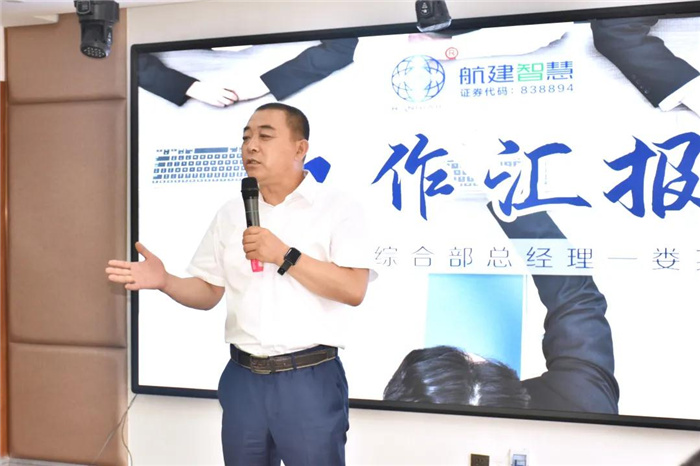 航建集团综合部总经理娄英杰先生对当前工作进行了总结,并主动找出自己部门工作的不足之处,表示接下来定会全力以赴,在原来公司管理体系及制度基础上继续完善,制定出一套更适合公司发展的更完善更科学的人员管理体系,助力公司上市之路。