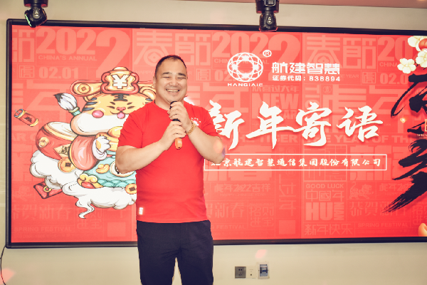 航建集团董事长于伟上台致辞,2021年已经过去,我们深怀感恩回首过往的同时,更要展望未来,不断克服困难,登上继续奋斗的道路,2022年希望各部门在领导班子的带领下,团结一致、攻坚克难,发挥各自能量,让我们共同努力,到达胜利的彼岸。
